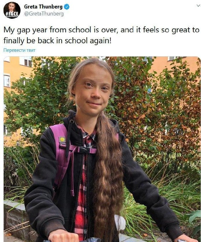 «Мой академический отпуск в один год закончился, так прекрасно снова вернуться в школу», — написала экоактивистка в Twitter