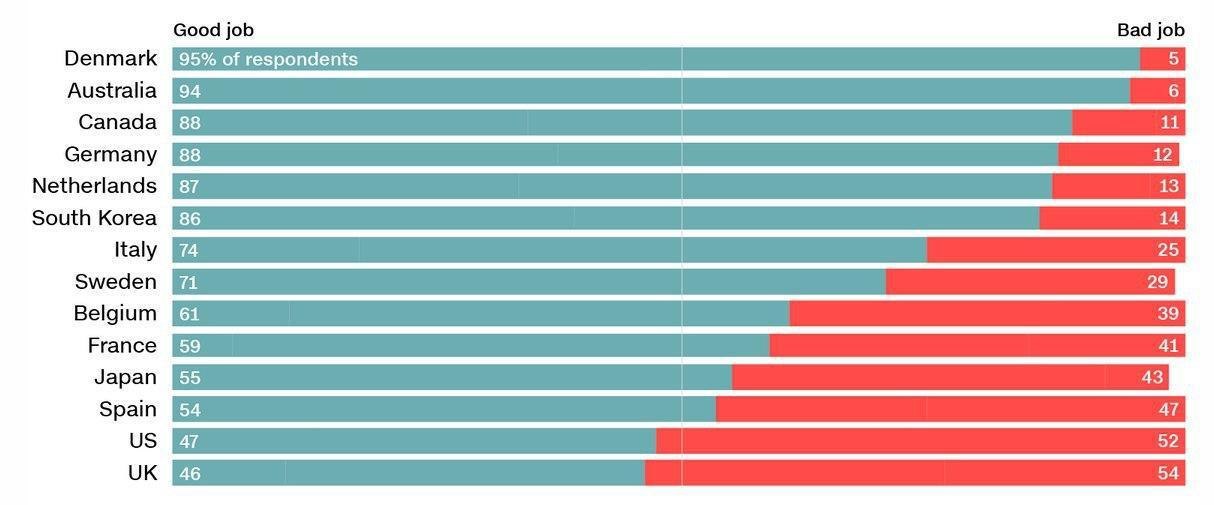 Вашингтонский Исследовательский центр Пью провёл опрос в 14 странах Запада. Жители 12 из них заявили, что власти хорошо справились с пандемией, и только в Великобритании и США с этим согласно меньшинство: 46 и 47% соответственно.