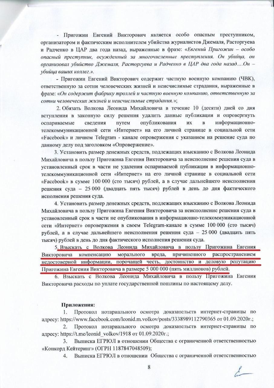 Иск подан из-за высказываний Волкова в соцсетях, где говорится, что Пригожин связан с гибелью российских журналистов в ЦАР в 2018 году. Также бизнесмен просит суд обязать Волкова опровергнуть эту информацию и удалить её.