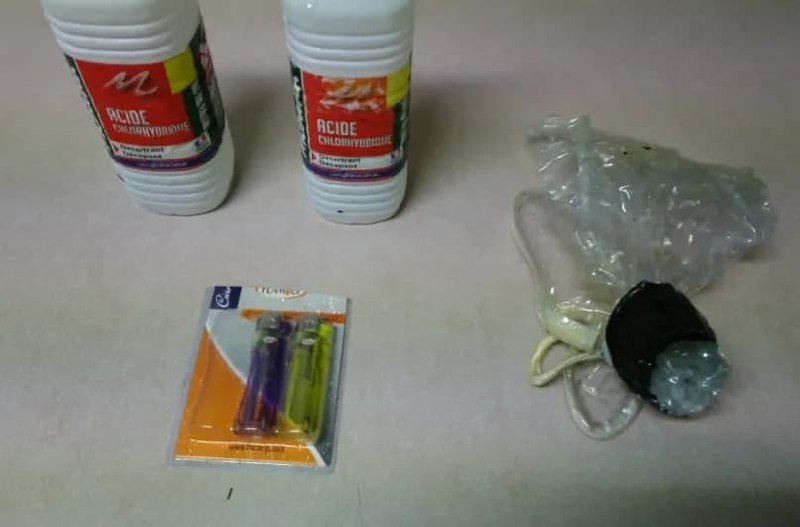 Вызвали полицию, задержан один человек. У него нашли две бутылки с кислотой и ёмкость с воспламеняющейся жидкостью (на фото).