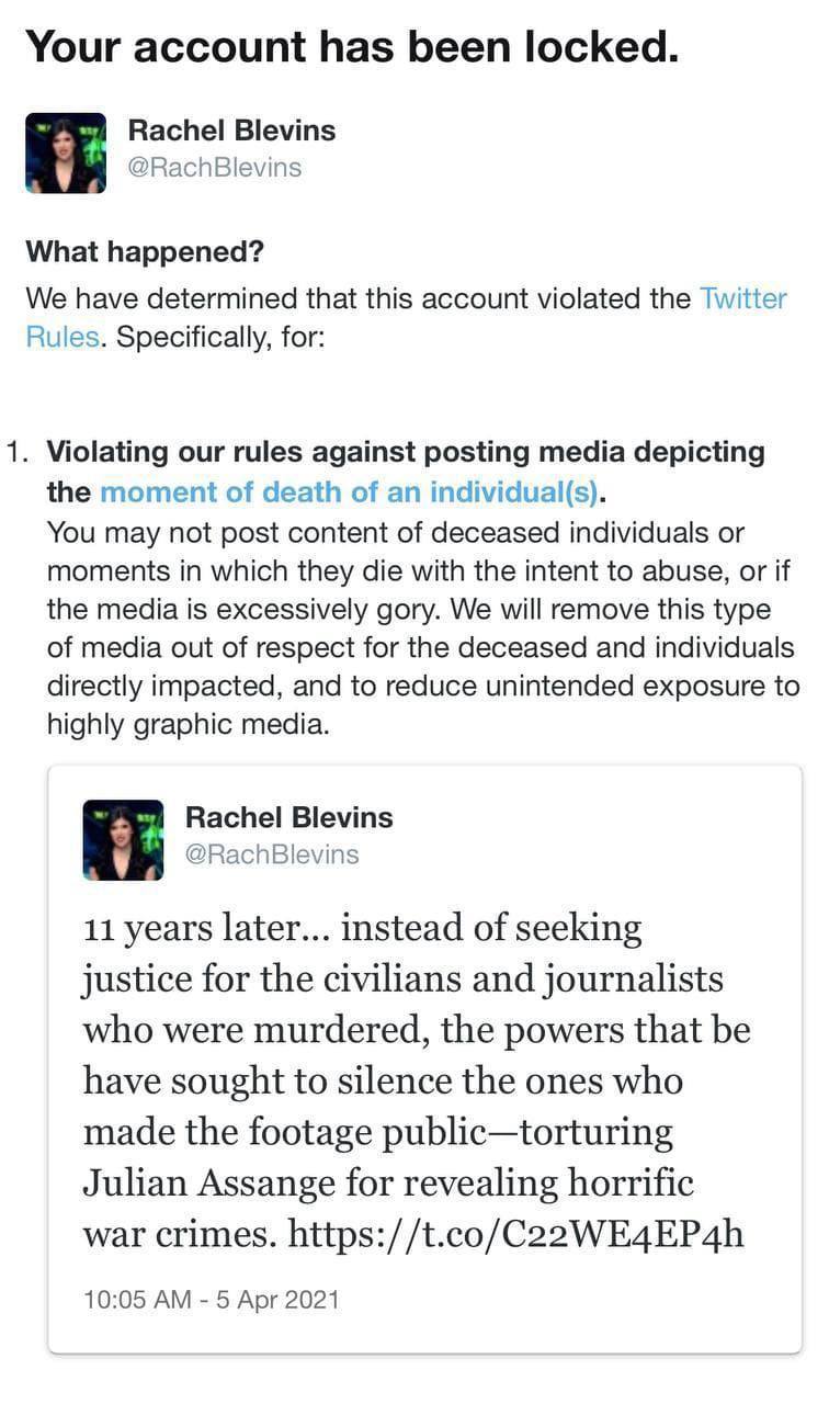 Twitter забанил аккаунт ведущей RT America Рейчел Блевинс за то, что она опубликовала ссылку на знаменитое видео из Ирака, которое слил WikiLeaks Джулиан Ассанж в апреле 2010 года.