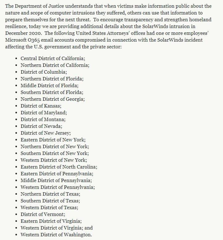 Всего, как заявляет министерство, во время хакерской кампании в каждом из 27 офисов прокуратуры США была взломана учётная запись электронной почты по крайней мере одного сотрудника.