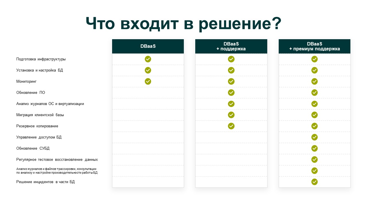 Важно, что ряд других технических процессов остается на вашем контроле: управление доступом БД и решение инцидентов, обновление СУБД, регулярное тестовое восстановление данных.