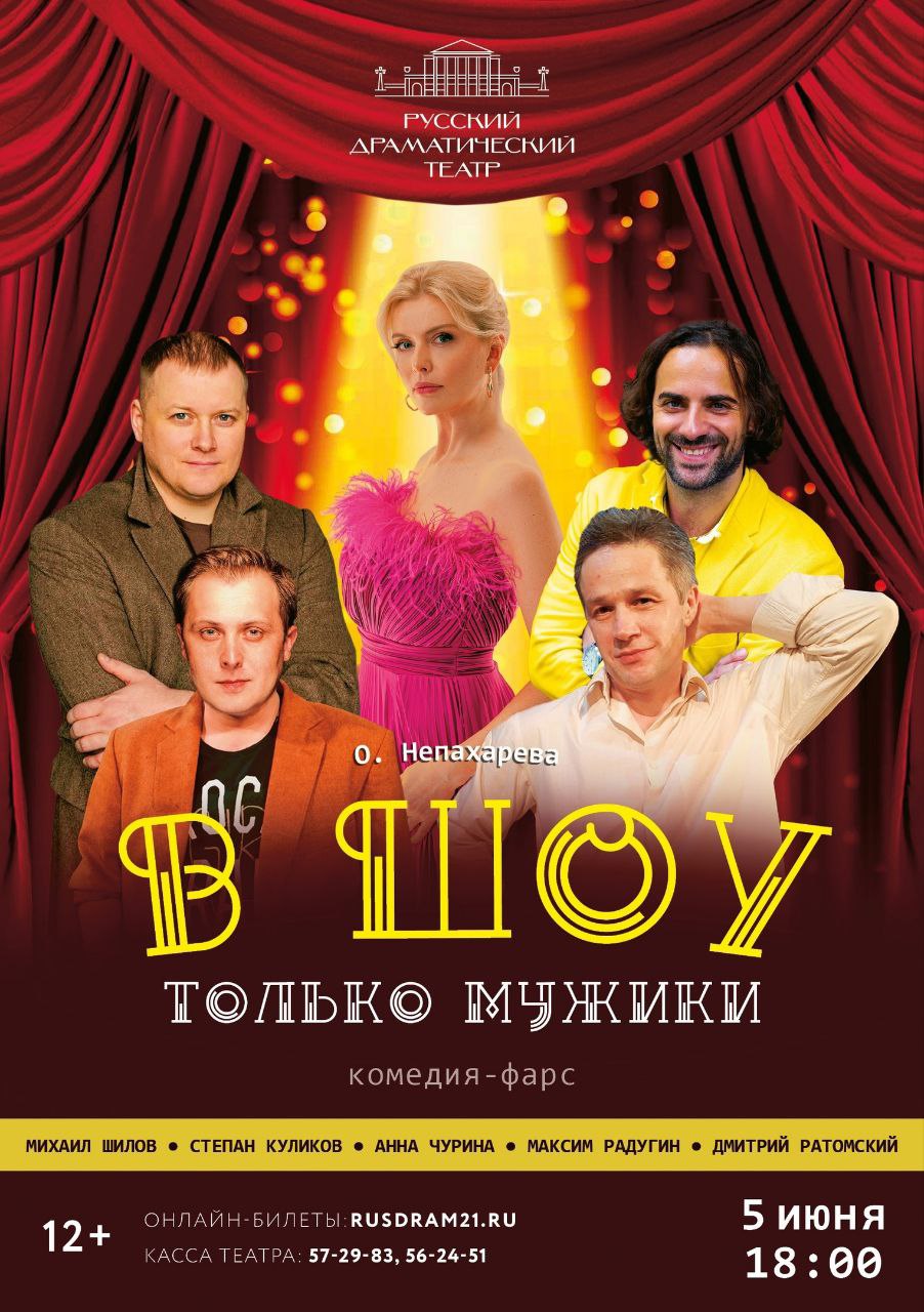 Счастливчику подарим два билета на комедию "В шоу только мужики" 12+, показ которой состоится 5 июня в 18:00 в Русском драматическом театре