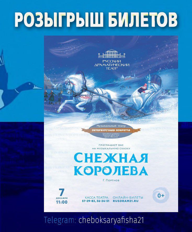 Счастливчику подарим 2 билета на мюзикл-сказку 👑 «Снежная королева», показ которой состоится 7 декабря в Русском драматическом театре г. Чебоксары. (3+)