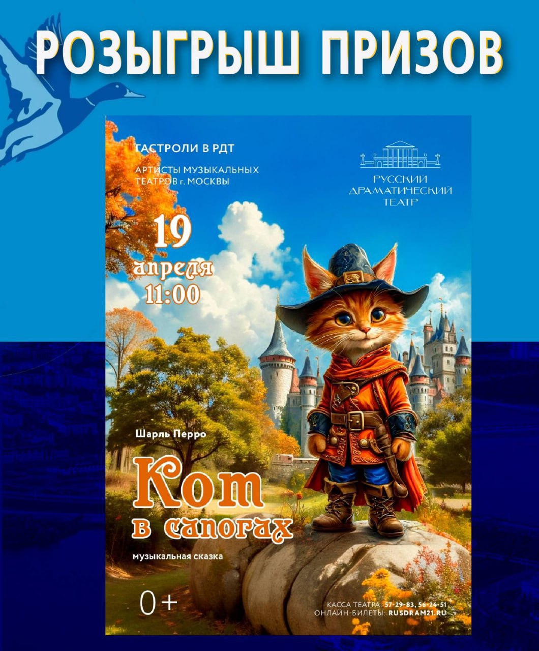Счастливчику подарим два билета на знаменитую сказку Шарля Перро "Кот в сапогах" (0+), которую представят 19 апреля московские артисты жанра оперетты на сцене Русского драматического театра г. Чебоксары.