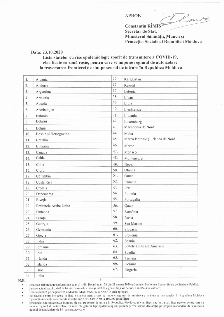 🦠Минздрав обновил список стран "красной зоны", для въезда из которых в Молдову необходима 14-дневная самоизоляция.