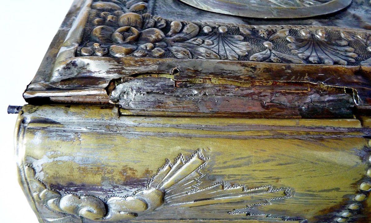 Оклады большинства напрестольных Евангелий сделаны из латуни – сплава меди с цинком. Неприятным свойством многих латуней является появляющаяся со временем хрупкость – даже при небольших напряжениях трескаются, как на этом фото. Толстые куски латуни при ударе раскалываются со сколом, как у кускового сахара – испытывал на образцах начала XX века, кусок более 10 мм толщиной достаточно легко раскалывается молотком.