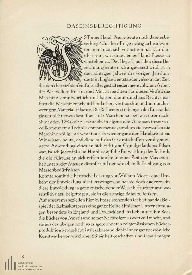 «Тот факт, что книга, как бы хорошо она ни была оформлена и отпечатана, выпускаемая для узкого круга друзей неким шрифтом в некой типографии на самой красивой бумаге ручной работы, сам по себе не дает оснований говорить о ручной печати. Как уже говорилось, книга с ручной печатью в подлинном смысле этого слова может быть создана только в результате цельной творческой работы, в которой шрифты, их расположение, декоративные детали и переплет создаются в соответствии с руководящей, заранее выработанной идеей, имеющей художественный замысел. Поэтому в Германии существует очень мало ручных типографий, которые могут по праву носить это имя, и наша, несомненно, может быть причислена к их числу».