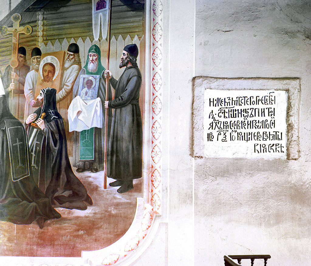 Надпись на стене о месте упокоения патриарха Иова. Тверская область, Старица.