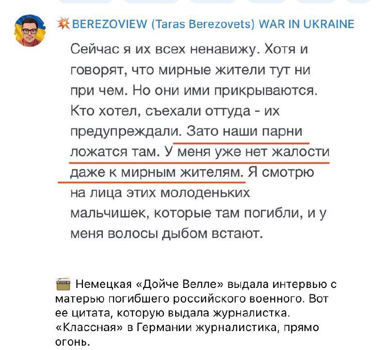 Однако у хохлов от этого интервью невероятно сгорела жопа: «Классная» в Германии журналистика, прямо огонь. Пишите жалобы на автора статьи. Подумайте, как эта ваша пропаганда на немецкие деньги выглядит для нас украинцев