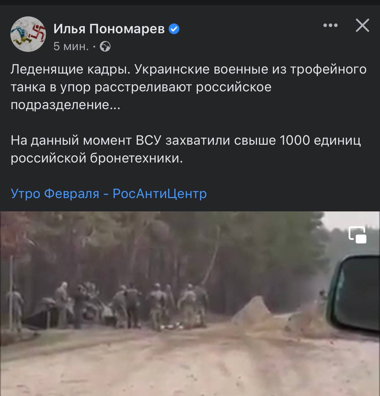 Та же история в изложении Ильи Пономарева: украинские военные из трофейного танка в упор расстреляли российское подразделение.