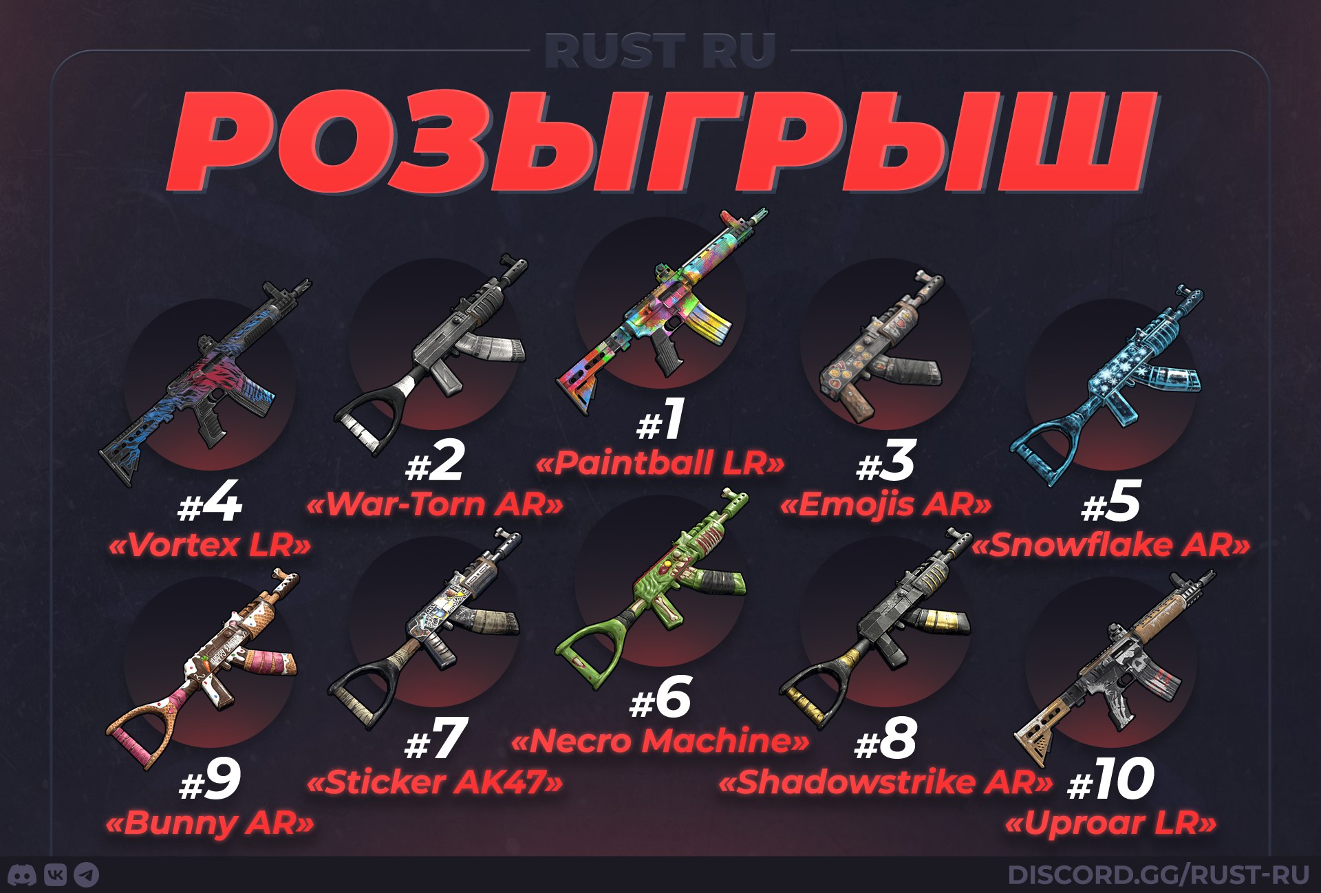 RUST RU pinned «Всем привет! Новый розыгрыш от Rust Ru! 1 место - Paintball LR 2 место - War-Torn AR 3 место - Emojis AR 4 место - Vortex LR 5 место - Snowflake AR 6 место - Necro Machine 7 место - Sticker Pack AK47 8 место - Shadowstrike AR 9 место - Bunny Blast AR 10 место…»