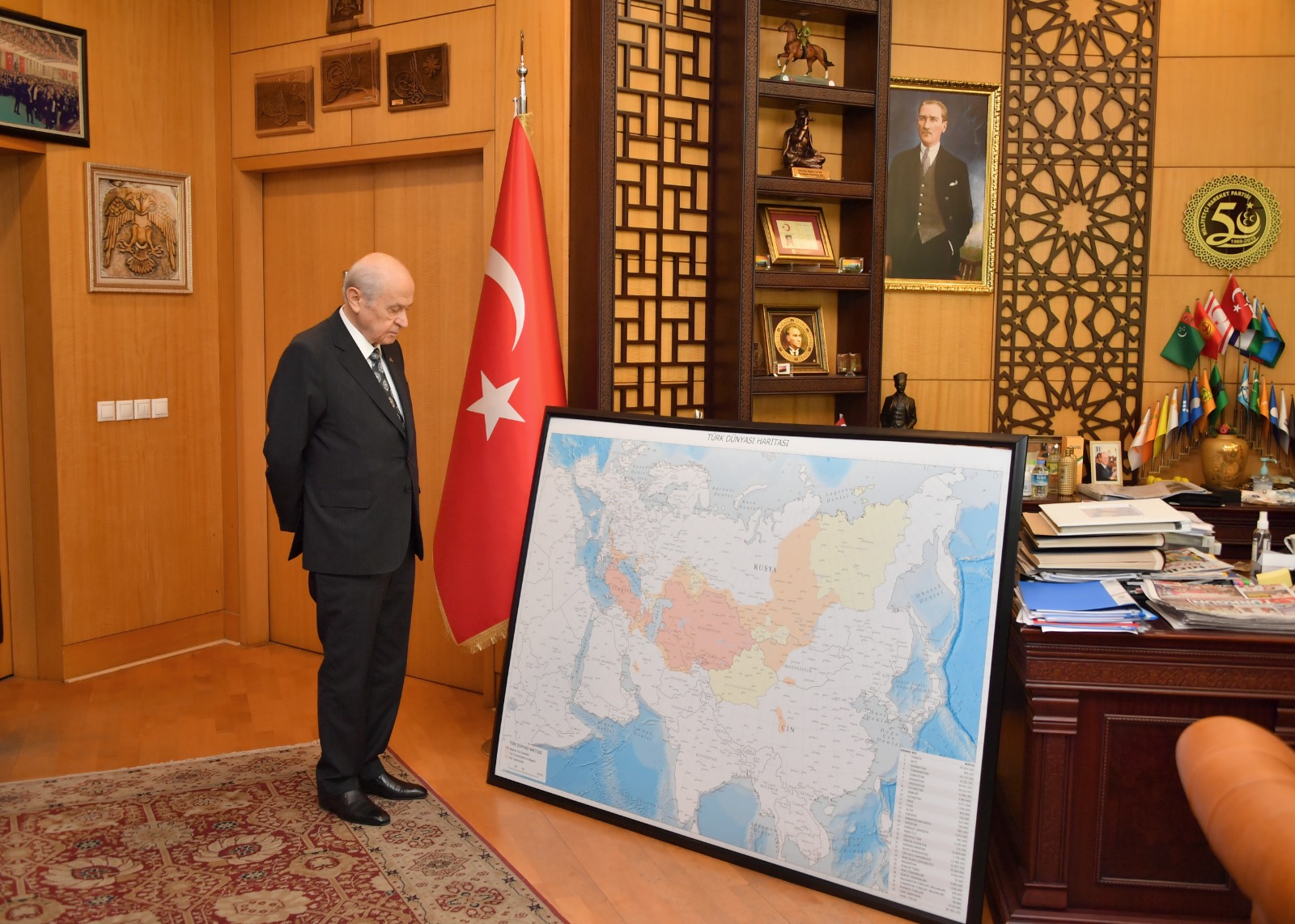 Согласно официальному сообщению, лидер Партии националистического движения Турции Девлет Бахчели работал над картой тюркского мира долгое время — это отражение турецкого самосознания.