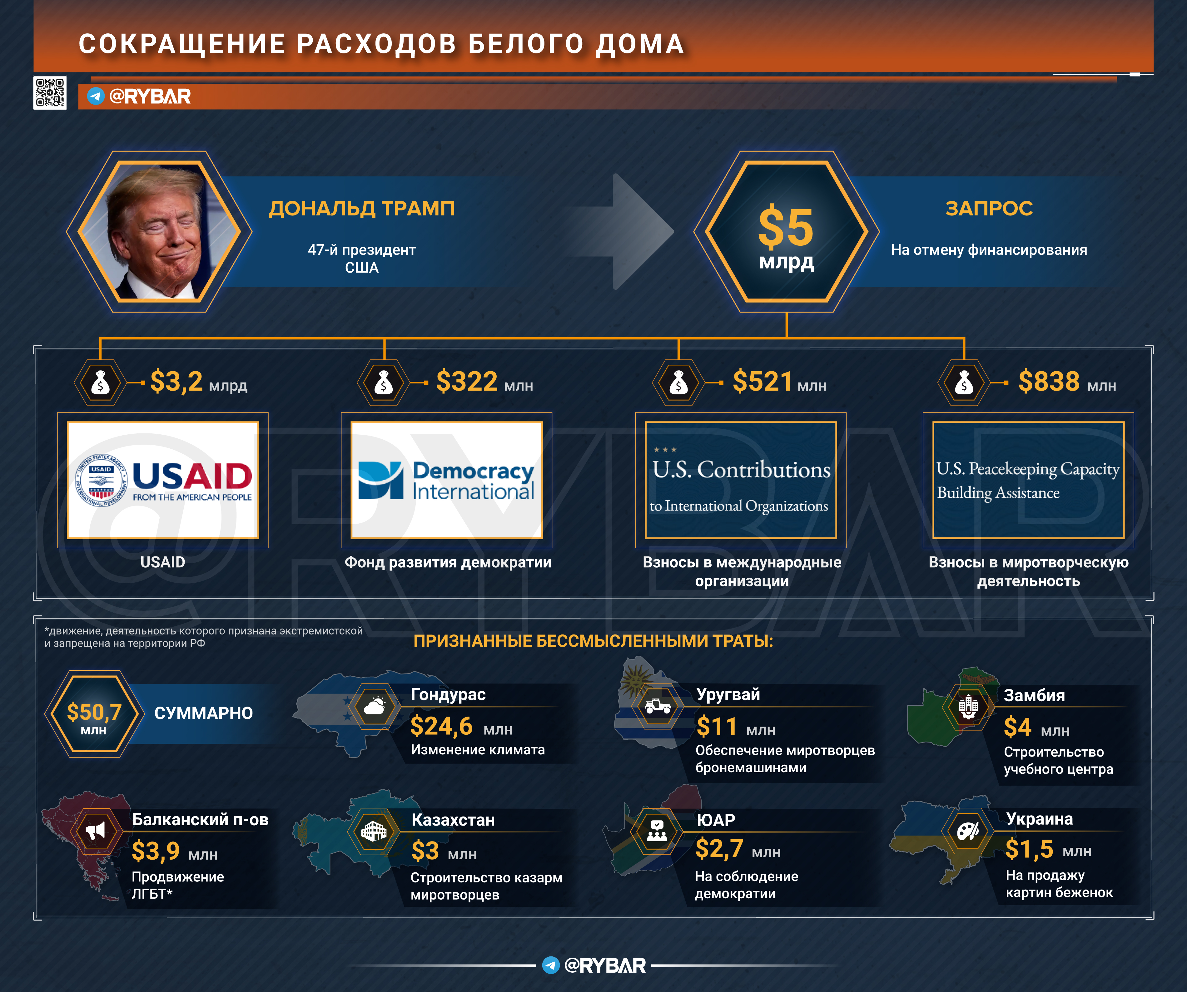 🔻 Что намерен урезать Трамп?▪️ Финансирование USAID, что вполне логично, учитывая юридическую ликвидацию Агентства и переформатирование внешней работы США.▪️ Фонд развития демократии, подведомственный Госдепу США, то есть под удар попадают такие программы как продвижение ЛГБТ на Балканах.▪️ Взносы в международные организации. Признаны ненужными траты на изменение климата или продажи картин украинских художниц.▪️ Взносы на миротворческую деятельность также урежут. В администрации Трампа посчитали, что финансирование бронемашин для Уругвая или строительство казарм для миротворцев в Казахстане ненужными расходами.▪️ Эти деньги предназначались для широкого круга некоммерческих организаций и иностранных правительств, но были приостановлены в начале этого года в рамках оптимизации бюджета.