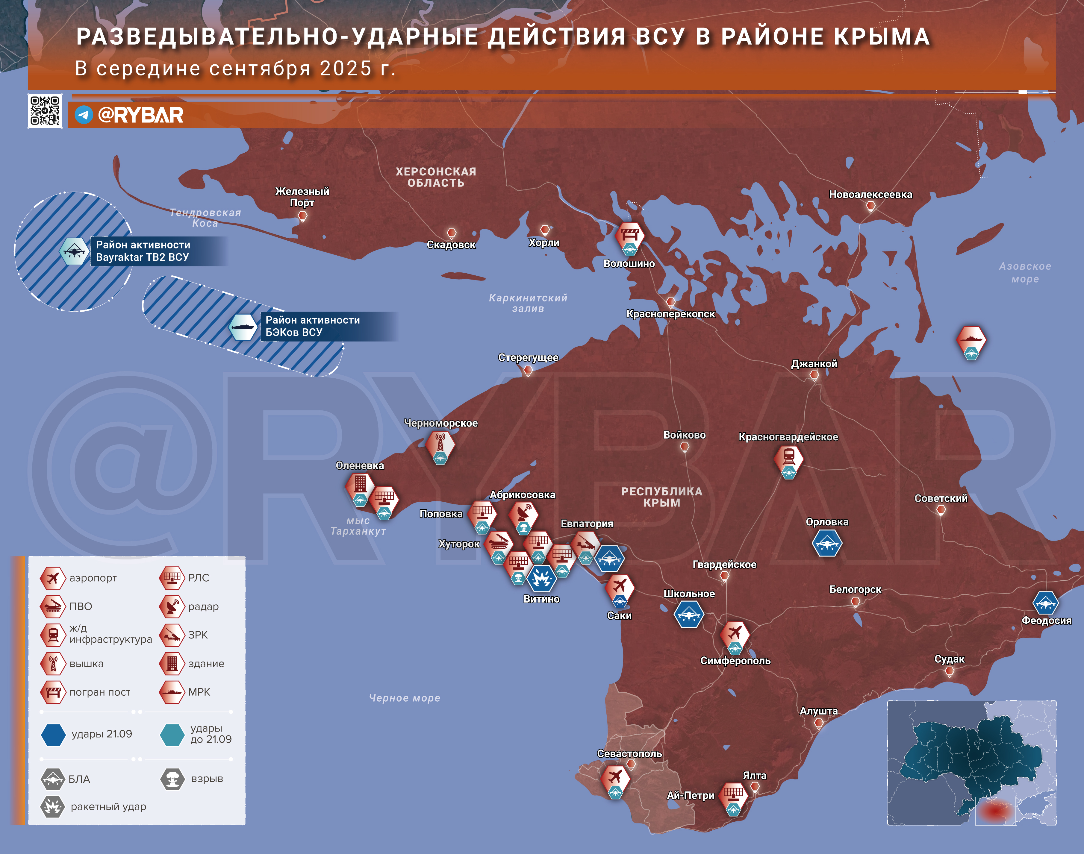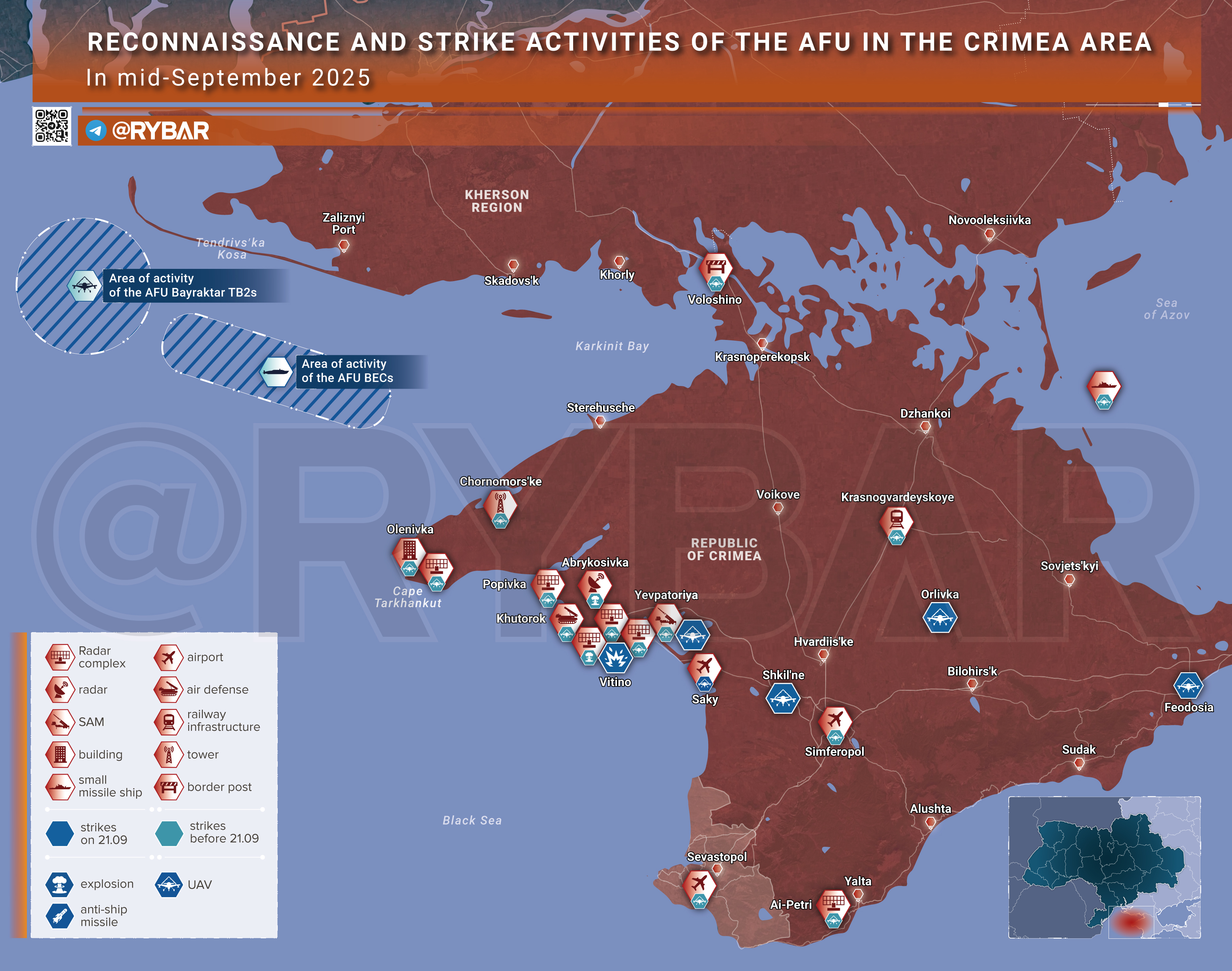 Украинские формирования продолжают методично атаковать военную инфраструктуру в западной части Крымского полуострова. Кроме того, ВСУ наращивают разведывательную активность в районе Тендровской и Кинбурнской кос.