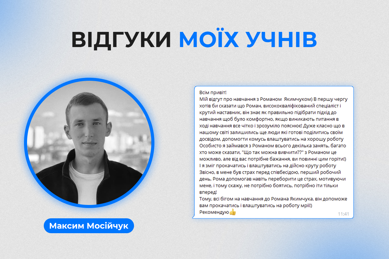 Мені надзвичайно приємно отримувати фідбек від людей, які пройшли моє навчання. Це заряджає та надихає на нові звершення, робити ще крутіше та якісніше для кожного з вас!
