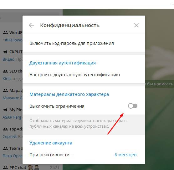 Коварство этой настройки в том, что её нет на ваших телефонах. Она есть только в десктоп-версии Телеги (приложении на компьютере). Нужно скачать и зайти в приложение под своим аккаунтом, открыть настройки, потом параметры «Конфиденциальность» и переключить ползунок в пункте «Материалы деликатного характера» (скриншот прикрепила).