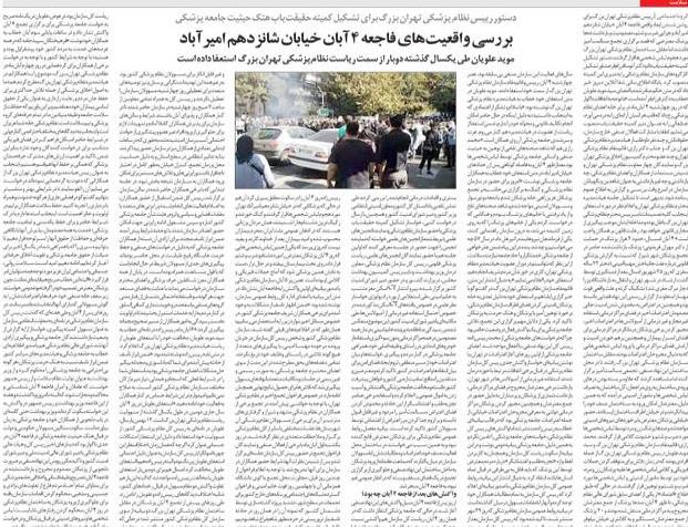 گزارش با درخواست نظام پزشکی تهران برای پیگیری موضوع شروع شده بود: "رييس نظامپزشكي تهران بزرگ براي روشن شدن ابعاد واقعي فاجعه ۴ آبان خيابان شانزدهم اميرآباد و چرايي ضرب و شتم، مصدوميت و بازداشت دهها پزشك معترضي كه قصد برگزاري تجمع مسالمتآميز داشتند اما مقابل ساختمان نظام پزشكي تهران بزرگ مورد هجوم لباس شخصيها قرار گرفتند، دستور تشكيل كميته حقيقتياب داد"