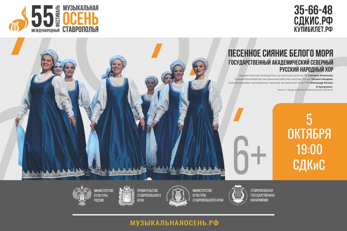Завершением 55-го Международного фестиваля «Музыкальная осень Ставрополья» станет выступление гостей из Архангельска – Государственного академического Северного русского народного хора, который представит концертную программу «Песенное сияние Белого моря».