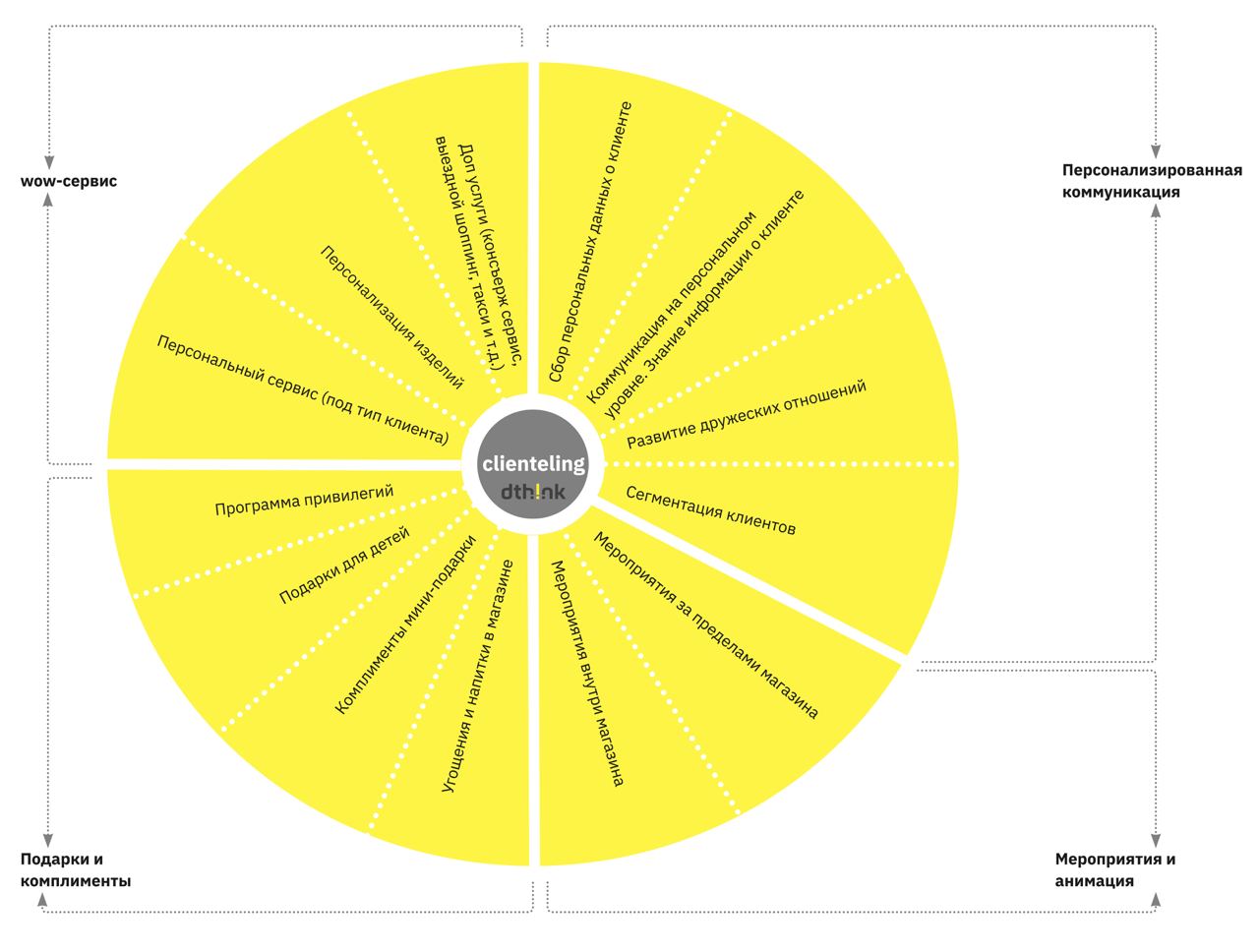 * Карта клайтелинга: персональная коммуникация, мероприятия и анимация, подарки и комплименты, wow-сервис.