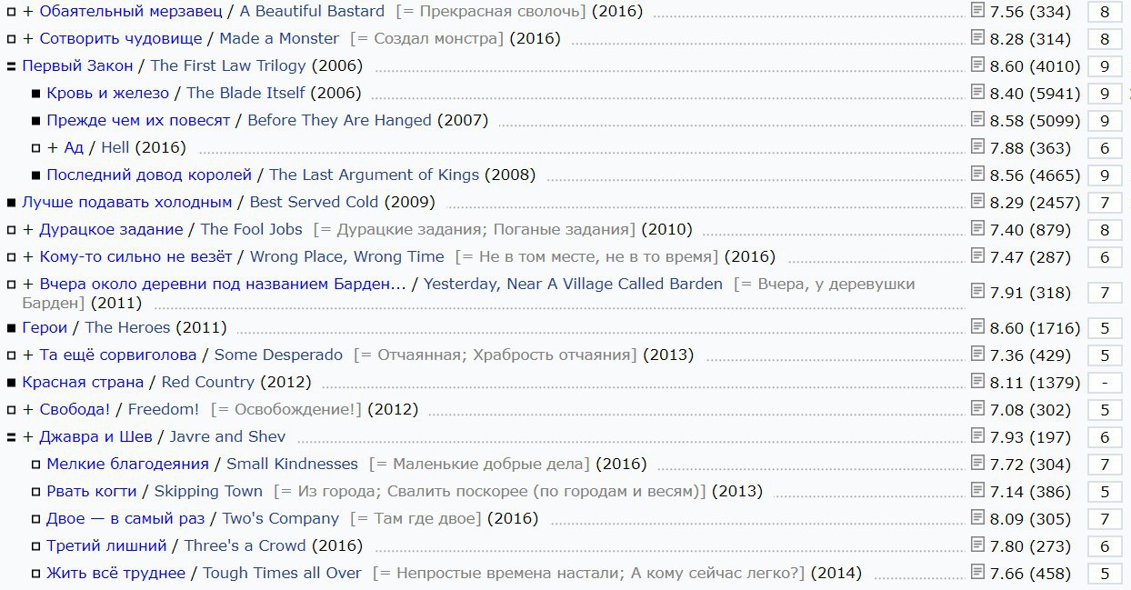 Столько всего надо написать... Как всегда. Я так и не сподобился хоть на какое-то резюме 2018-го ушедшего, как уже пора выражать мысли по поводу учитанного в 2019-ом. Про восемнадцатый я все-таки напишу отдельно (хотя вы уже знаете, чего стоят мои истории "когда-нибудь обязательно напишу"...). А сейчас хотел пару слов про Аберкромби. Решил в этом году попробовать и его полистать и встрял капитально. Подготовился как следует, посмотрел порядок цикла на фантлабе, прочитал сперва два рассказа, потом романы по очереди, в общем не допустил прошлых ошибок. С рассказами (написаны в 2016) сочетается прекрасно (романы начинаются с 2006). Они добавляют непонятным с самого начала романов героям живости, читать с пониманием бэкграунда гораздо приятнее. Единственный вопрос до конца первой книги был, что произошло с варваром, но в финале все встает на свои места. И все оставшиеся открытыми вопросы к завершению трилогии закрываются. Это само по себе прекрасно. Четвертая книга не так замечательна, здесь все-таки закрался рояль в виде имба персонажа, происхождение которого никак не объясняется. Плюс в какой-то момент я понял, что меня нервирует манера обрезать сюжетные нити. Видимо, не дает покоя пример Мартина, что мне кажется несколько пошлым. Прочитал следующие рассказы начал пятую книгу. При том, что сегдня только 10-ое... В общем-то, итог какой. Прекрасное фэнтези. Пишет Аберкромби замечательно. Есть свои авторские фишки. В целом более чем достойно рекомендации, если речь идет о выборе фэнтези.