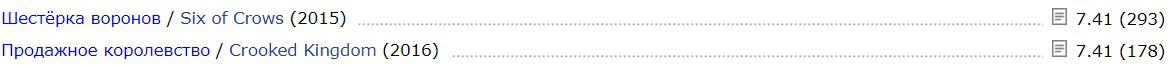 Гудридс подкинул очередную подборку. Обнаружил там для себя Ninth House Ли Бардуго. Не сказать, что я дичайше зафанател от Шестерки воронов, но свои заслуженные Шесть баллов они получили. Ладно, может должны были бы получить пять все-таки, но я сделал скидку. Ничего исключительно плохого там нет, местами даже интересно. Но и хорошего найти не так просто. В общем кое-как барахтается. Так и не нашел сил взяться за вторую часть. И тем более за "пролог" истории из трех томов (точнее цикла - "Гришиверс" 🙈). Но, тем не менее, написано не так плохо, что-то в этом всем есть. Самое интересное, что первый и второй том имеют одинаковые оценки на фантлаб. Уникальный случай. Картинка ниже.