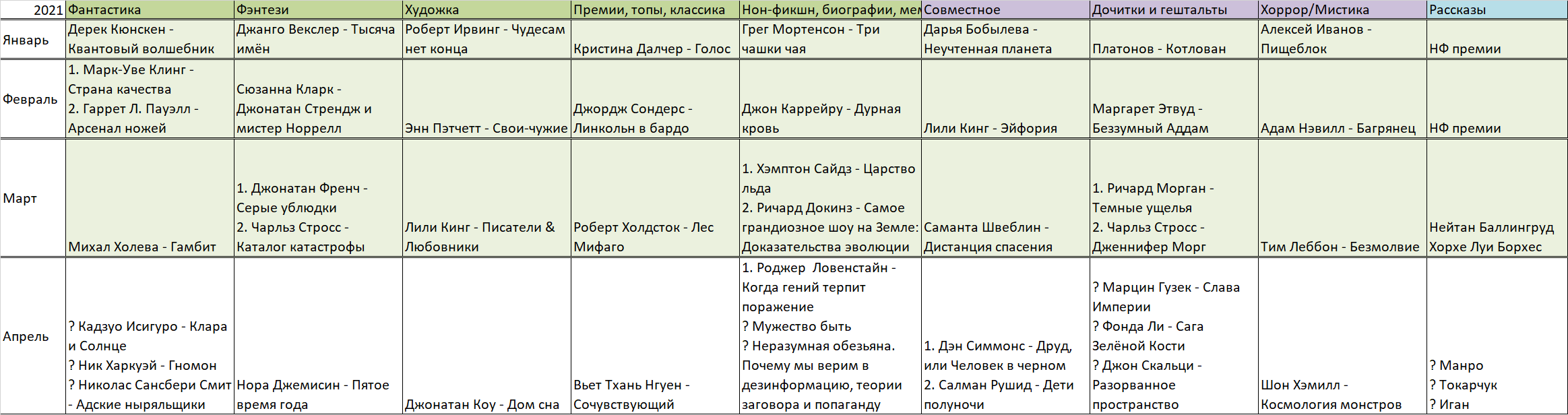 В апреле не справился с частью своей же обязательной программы — не прочитал Нгуена и Рушди. Поэтому они помечены на картинке ниже красным. Из списка их не убираю, прочитаю позже. Сроки нарушены, но обязательства остались. Звучит немного напыщенно, но под обязательствами скрывается интерес. Иначе просто вычеркнул бы и до свиданья.