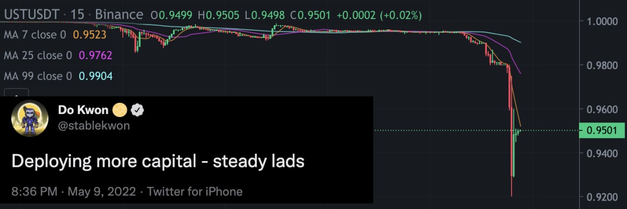 / Luna обосравшись вывели часть ликвидности с Curve (протокол кредитования), но злодей подкинул дохлую собаку - забрал всю ликвидность с пула Curve ($350 млн) и начал продавать UST на Binance, именно из-за этого случилась небольшая пег от $1.