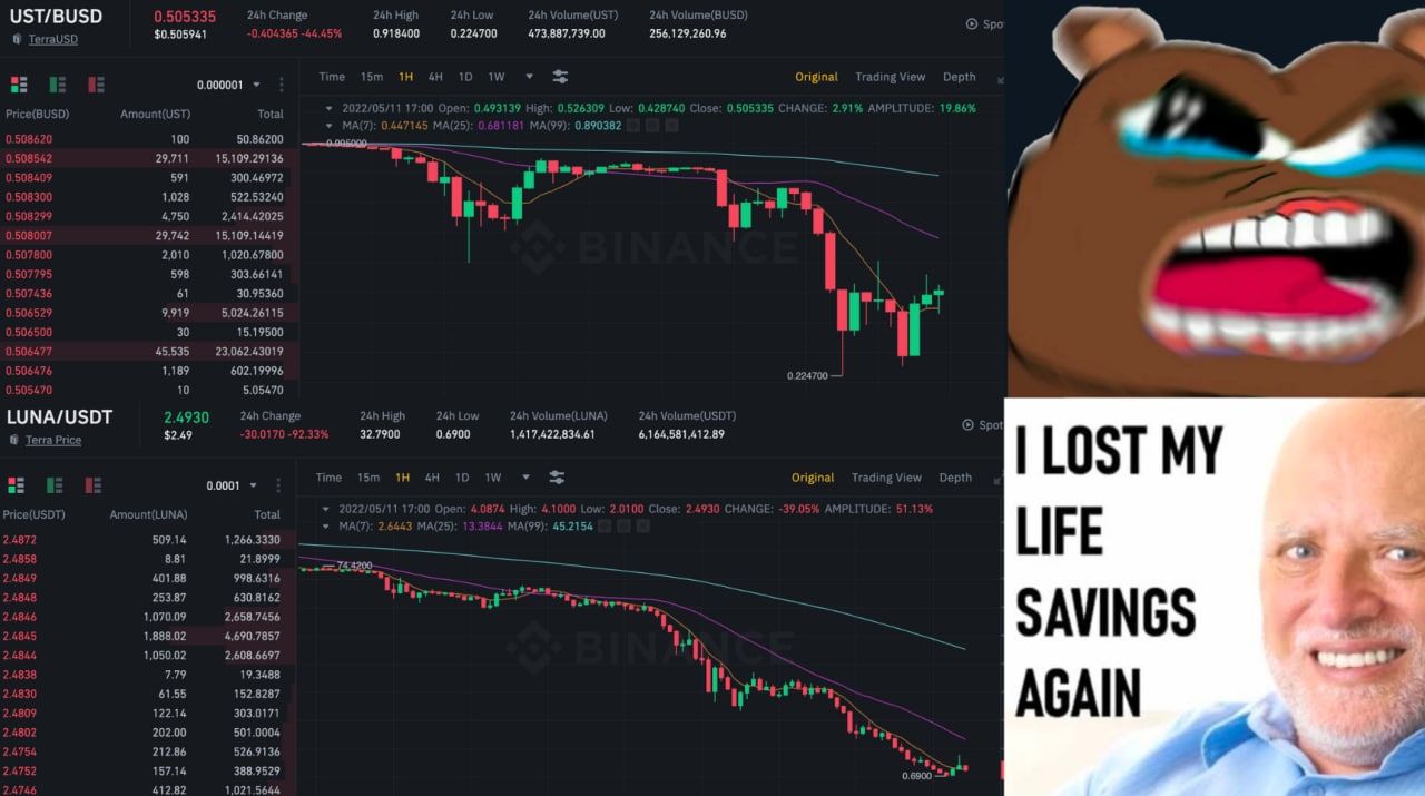 / Начинается паника, сеть Terra перегружается, вывод с бирж останавливается, с Anchor (стейкинг UST) бегут все кто не спит.