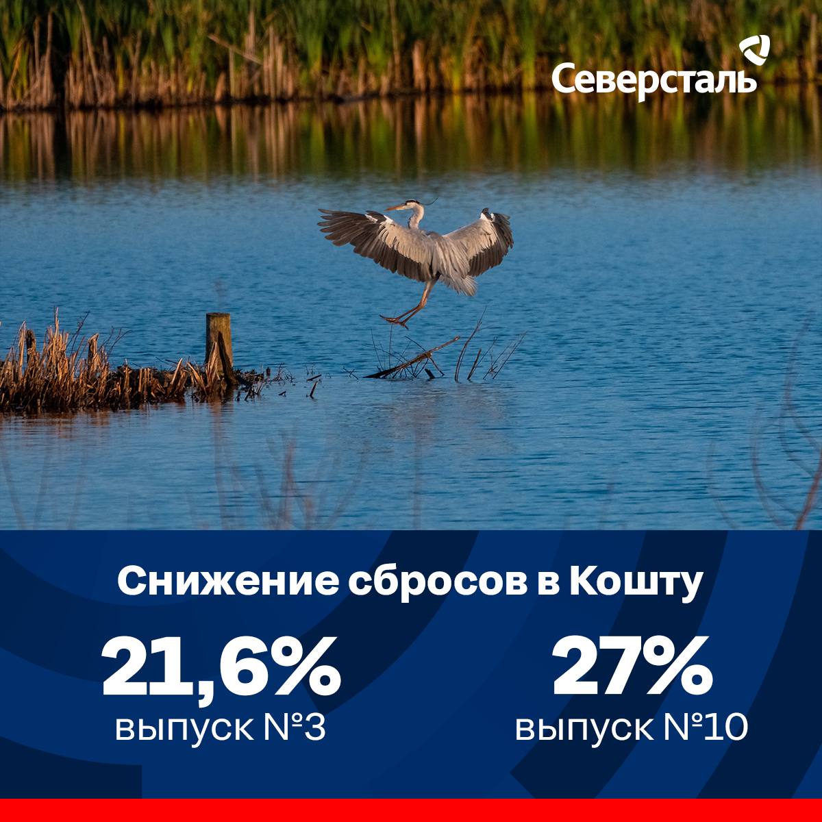#СеверстальЭкология: по итогам 2020 года снижение сброса загрязняющих веществ в реку Кошта по выпуску №3 составило 21,6% а по выпуску №10 – 27%.
