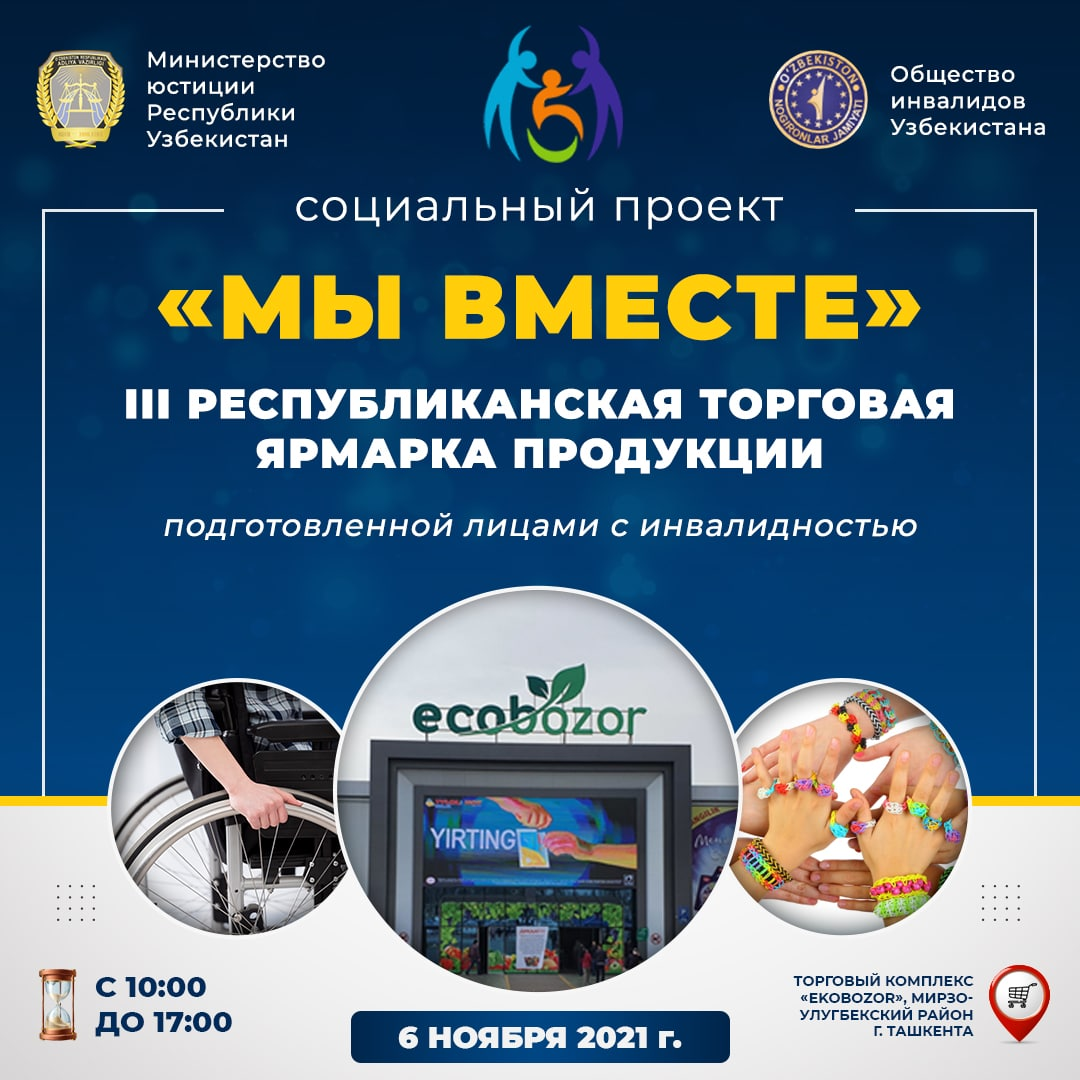 🔘 Жорий йилнинг 6 ноябрида “Биз биргамиз” ижтимоий лойиҳаси доирасида Тошкент шаҳри Мирзо Улуғбек туманидаги “ECOBOZOR” савдо мажмуасида ногиронлиги бўлган шахслар томонидан тайёрланган маҳсулотлар III Республика савдо ярмаркаси ўтказилади.