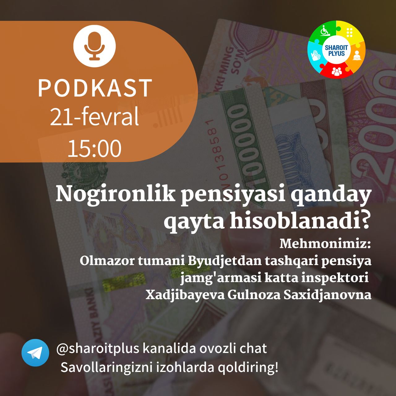 sharoitplus.uz pinned «#podkast 💰👩🦽 NOGIRONLIK PENSIYASI QANDAY QAYTA HISOBLANADI? 🧮 Xabaringiz bo’lsa “Nogironlik pensiyalarini qayta hisoblash to‘g‘risida"gi qonunga ko‘ra 2023 yil 1 yanvardan boshlab I va II guruh nogironligi bo‘lgan shaxslarga pensiya tayinlangandan keyin…»