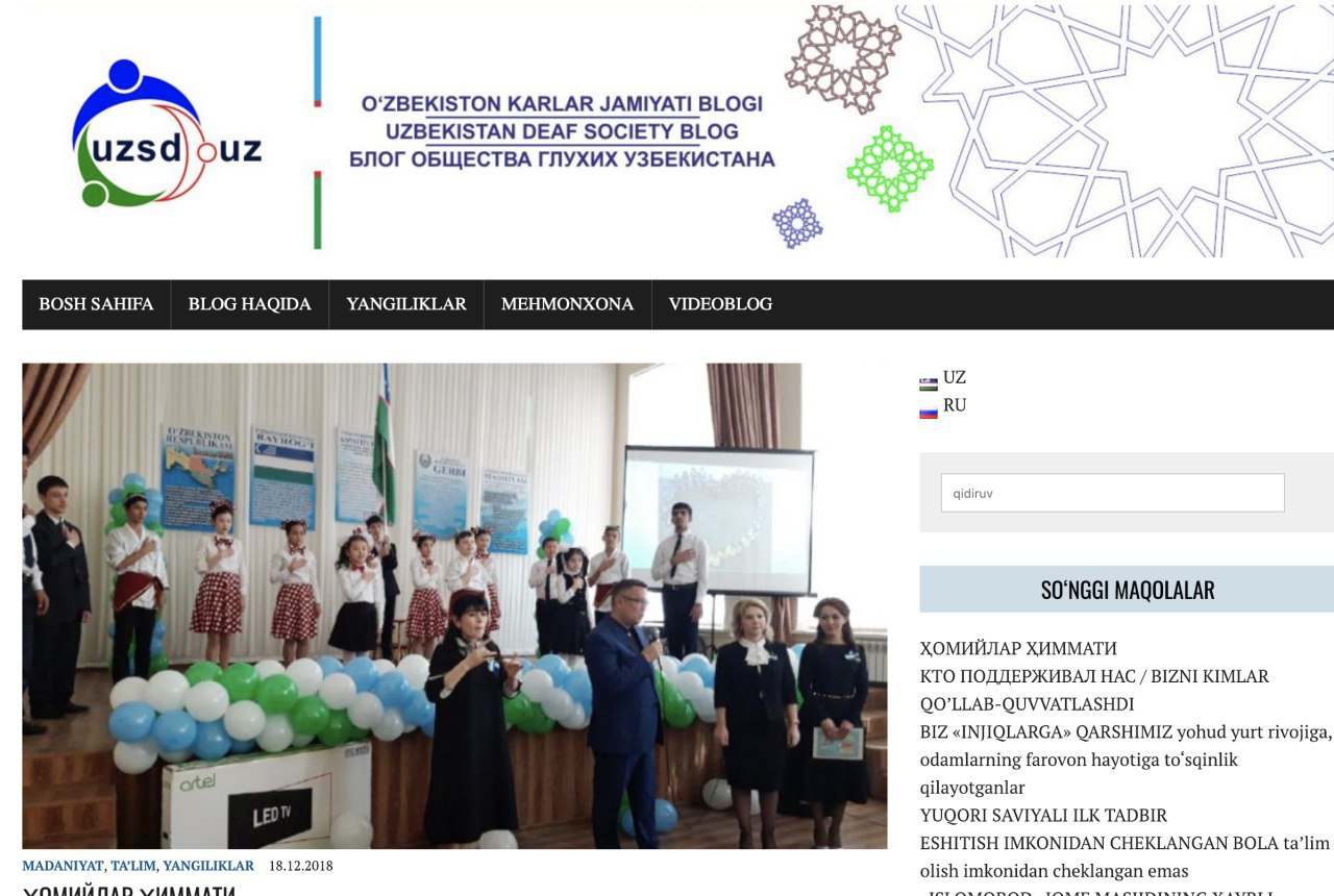 Welcome to the blog of the Society of the Deaf of Uzbekistan! Due to the fact that in Uzbekistan there was not a single website or source of information for people with hearing impairments Mamur Akhlidinov decided to create this blog. The blog is mainly targeted at people with hearing impairments and covers topics such as education, science, sports and culture. In addition, the blog also publishes news about events happening in the world, conversations with famous people with hearing impairments. Follow the news on the blog: http://uzsd.uz/