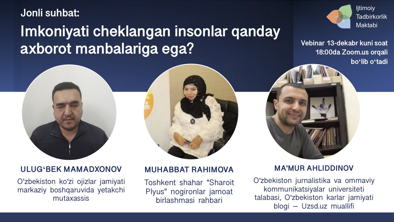 🔊 BMTning "Nogironlar huquqlari to‘g‘risidagi" konvensiyasi qabul qilingan kun munosabati bilan Ijtimoiy tadbirkorlik maktabi Sizlarni 13-dekabr kuni soat 18:00 da “Imkoniyati cheklangan insonlar qanday axborot manbalariga ega?” mavzusidagi vebinarga taklif etadi