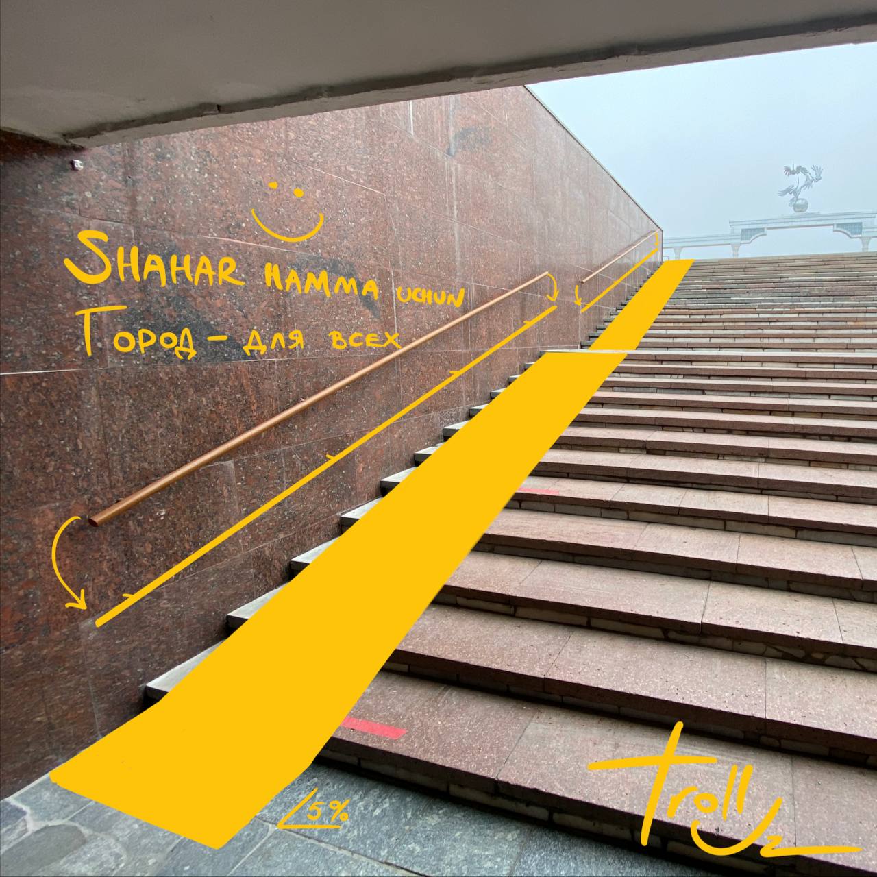 Самая распространенная проблема в городах Узбекистана это то, что они совсем не приспособлены для людей с ограниченными возможностями. Я сейчас не о метро, хотя метро тоже должно быть для всех. Можно начать хотя бы с подземных переходов и всех мест, где есть ступеньки.