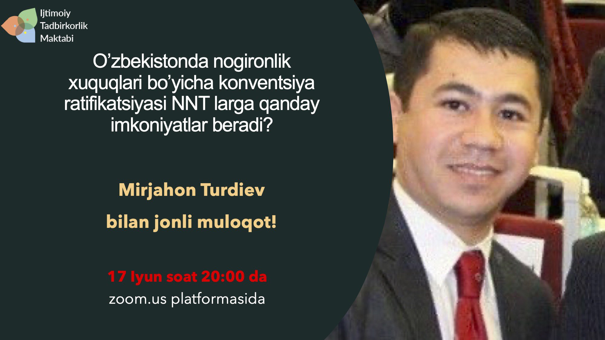 Ijtimoiy tadbirkorlik maktabi Sizlarni “O’zbekistonda nogironlik xuquqlari bo’yicha konventsiya ratifikatsiyasi NNT larga qanday imkoniyatlar beradi?” mavzusidagi jonli muloqotga taklif etadi!