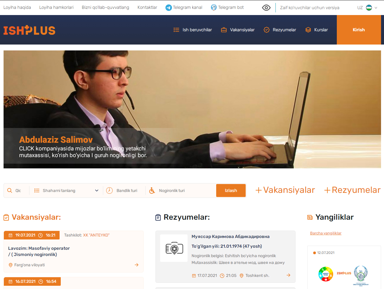 www.ishplus.uz - Ўзбекистонда биринчи инклюзив рекрутинг портали бўлиб, у ерда турли ҳил ногиронлиги бўлган иш изловчилар учун вакансиялар ва касбий таълим курслари эълон қилиняпти.