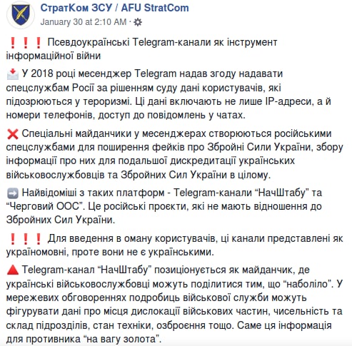 "Специальные площадки в мессенджерах создаются российскими спецслужбами для распространения фейков о ВСУ, сбора информации о них для дальнейшей дискредитации украинских военнослужащих и ВСУ в целом. Самые известные из таких платформ - Telegram-каналы "НачШтаба" и "Дежурный ООС". Это российские проекты, не имеющие отношения к ВСУ".