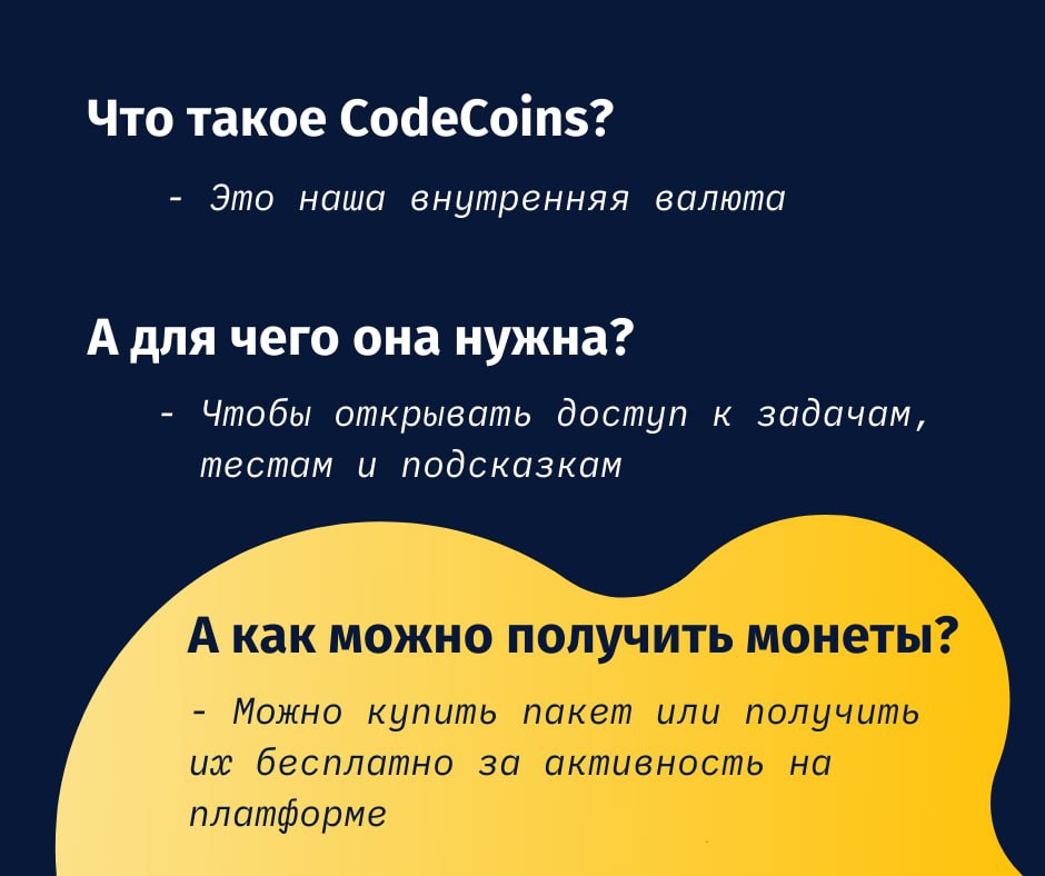 CodeCoins - внутренняя валюта на платформе IT Resume. За нее вы можете покупать некоторые задачи, тесты, подсказки и решения!