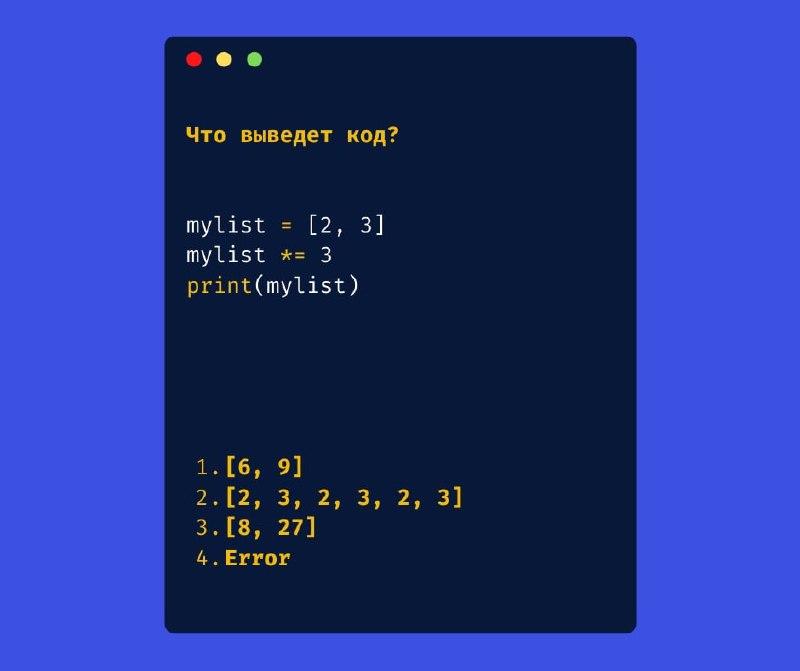 Т.е. mylist *= 3 возвращает список из трех повторяющихся исходных списков. В нашем случае это даст 2, 3, 2, 3, 2, 3.