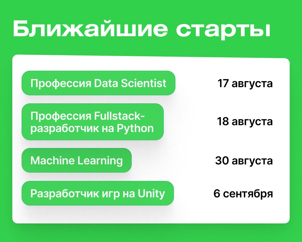 Забирайте повышенную 45%-ную скидку по промокоду ЦЕЛЬ и достигайте желаемого за пару месяцев продуктивной работы. Бонус активен до 31 августа и не суммируется с другими скидками сайта. Переходите по ссылке к понравившемуся курсу, чтобы применить код ⬇️