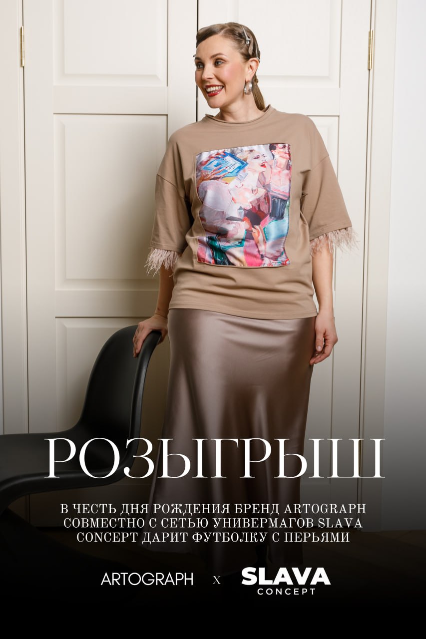 Бренд ARTograph совместно с сетью универмагов SLAVA сoncept устраивает праздничный розыгрыш в честь Дня рождения бренда. Мы хотим подарить вам футболку с перьями и картиной Рената Рамазанова «Модель. Шанель №5», которая станет особенной деталью ваших праздничных образов.