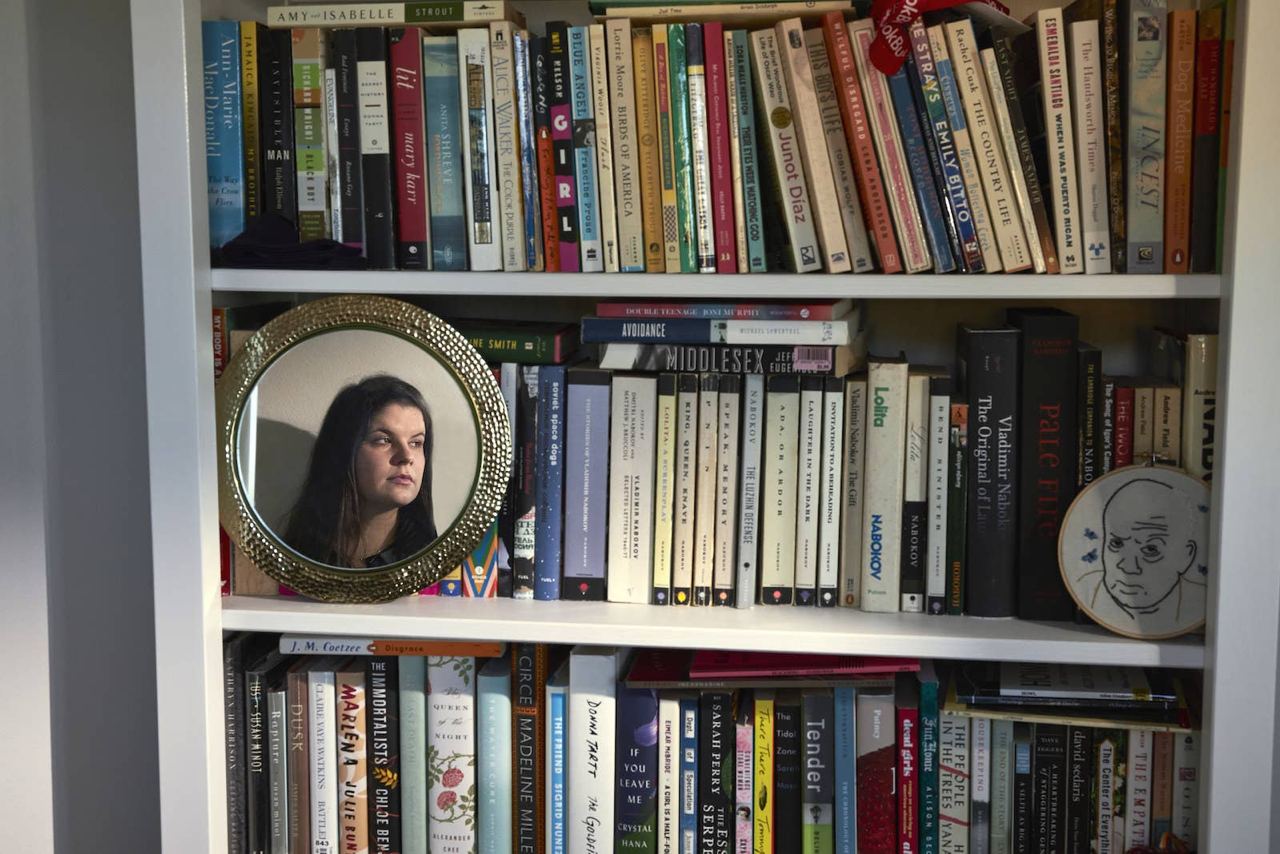 а вот так выглядит книжный шкаф Кейт Элизабет Расселл. не знаю, в какой момент по моей щеке побежала слеза – когда увидел «Камеру обскура» на русском или когда рассмотрел — что же еще — «Бесчестье».