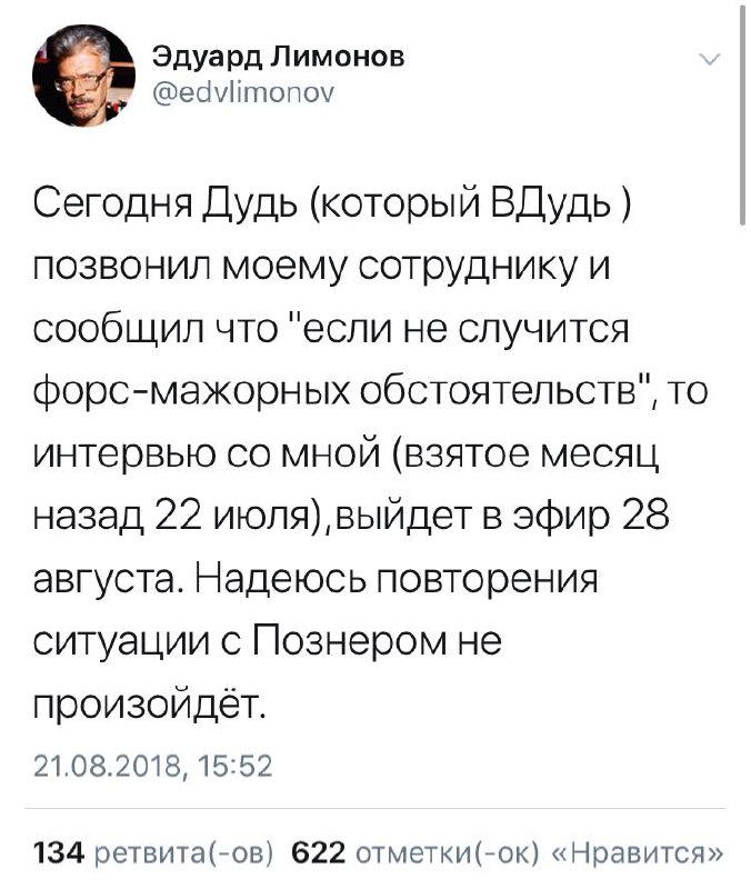 когда-нибудь это должно было случиться: напротив человека, не различающего бандита и держиморду, сядет большой русский писатель, который сегодня бесит всех, кроме меня и Олеси Герасименко. другое дело, что уже сейчас можно представить себе драматургию этой беседы, основные ее развилки и, конечно, главный вопрос — ну да, про самую обсуждаемую (и самую нежную) сцену из «Эдички». есть ощущение, что «Дудю (который ВДудь)» не помешал бы для этого интервью хорошо информированный консультант: я бы, например, с интересом послушал про нью-йоркскую встречу ЭВЛ с Труменом Капоте, знакомство с Профферами и Бродским и — оборвавшуюся уже, наверное, — дружбу с Сашей Соколовым.