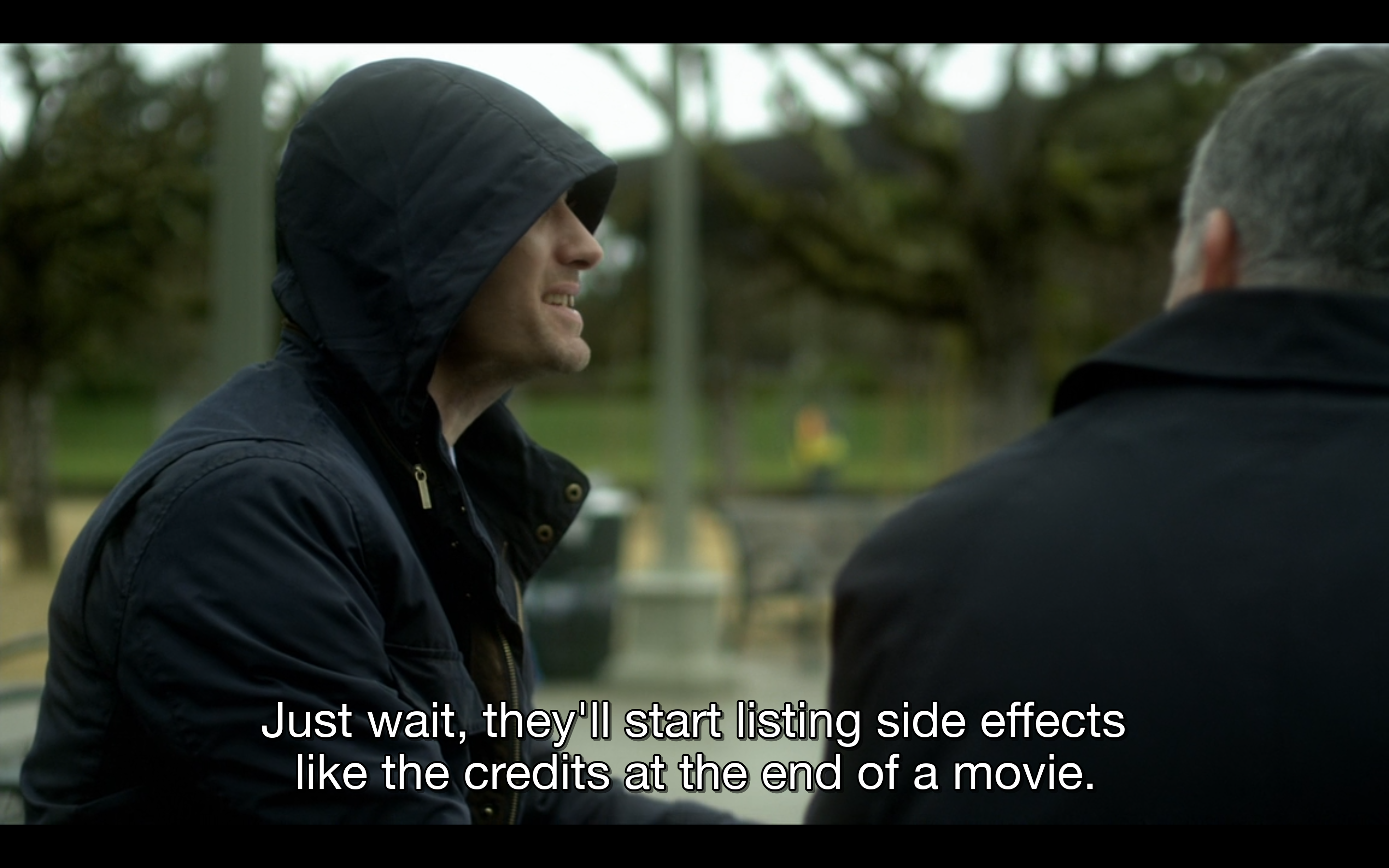 в «Заражении», которое все сейчас с упоением пересматривают (скажу, может быть, кощунственную вещь: совсем уже солнцеликим гением Стивен С. стал, когда решил уйти из кино; то есть период, начавшийся в 2011 году, — пожалуй, лучший отрезок в его фильмографии), видят уникальный в своем роде гимн системе, отмечают великолепное, как всегда у этого автора, владение формой, смакуют то, что тут происходит с народными артистами (обойдемся без спойлеров). мне отчего-то дорога реплика, которая ретроспективно обретают мерцающее метатекстуальное содержание: через два года Лоу сыграет в х/ф Side Effects психиатра, выписавшего пациентке экспериментальный препарат — с прискорбным для своей профессиональной карьеры последствиями. режиссер и сценарист, конечно, те же.