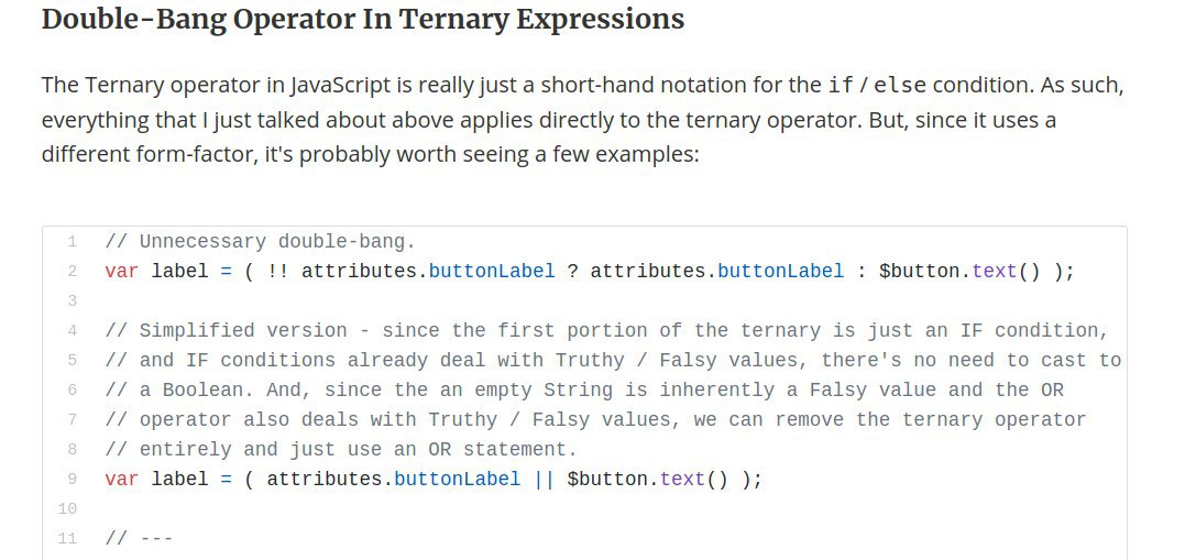 The Double-Bang (!!) Operator. And A Misunderstanding Of How JavaScript Handles Truthy / Falsy Values. Интересная статья Дарена Вокера о том, когда стоит, а когда нет использовать двойной булевый оператор в мире js и react → https://bit.ly/2ZEQHdH