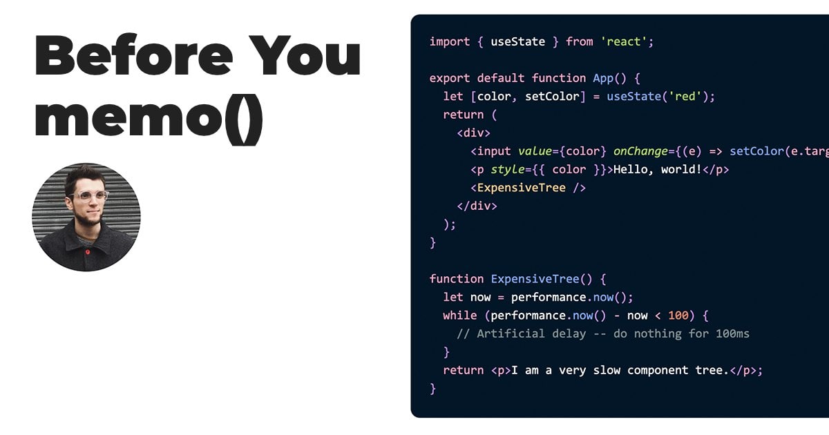 Before You memo(). Ден Абрамов показывает как улучшить перформанс компонентов изолировав изменения их состояний или переместив их ближе к отрисовке → http://bit.ly/2ZIDlxl