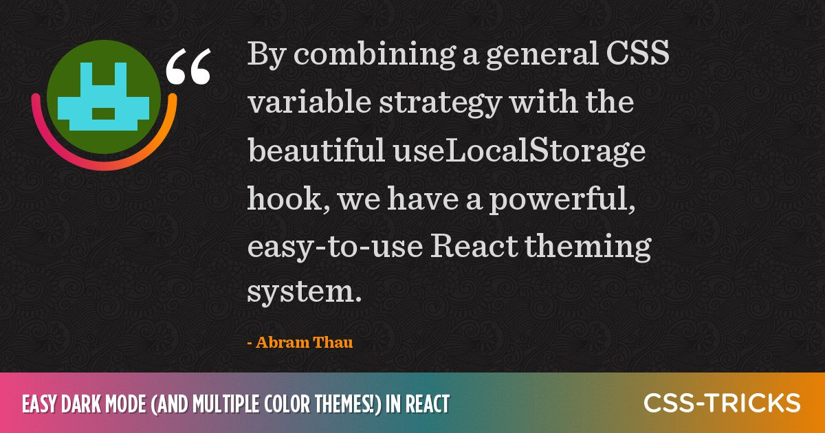 Easy Dark Mode (and Multiple Color Themes!) in React. Описание способа установки различных тем с помощью css переменных → https://bit.ly/3l7131t