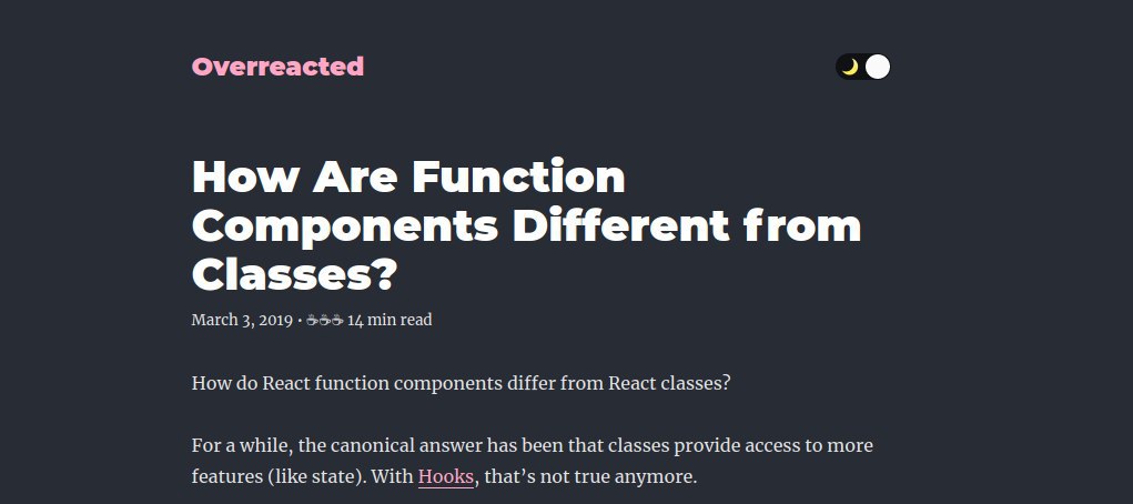 How Are Function Components Different from Classes?. Пост Дена Абрамова о том, чем функциональные компоненты отличаются от классов, как замыкания помогают нам избежать багов в edge-кейсах и как в свете всего этого исопльзовать хуки → http://bit.ly/2Turcut